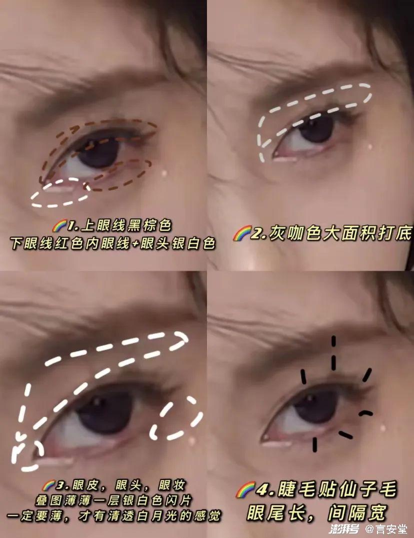 下眼睑先画出明显的卧蚕,然后将眼妆中最为突出的颜色,小范围晕染在下眼睑贴近睫毛根部的位置,也可以略微点缀一些大闪片,最终让眼妆与眉毛形成一个倒三角形,配合纤长卷翘的“太阳花睫毛”营造出眼睑下至的感觉,柔美无辜的氛围感拉满!