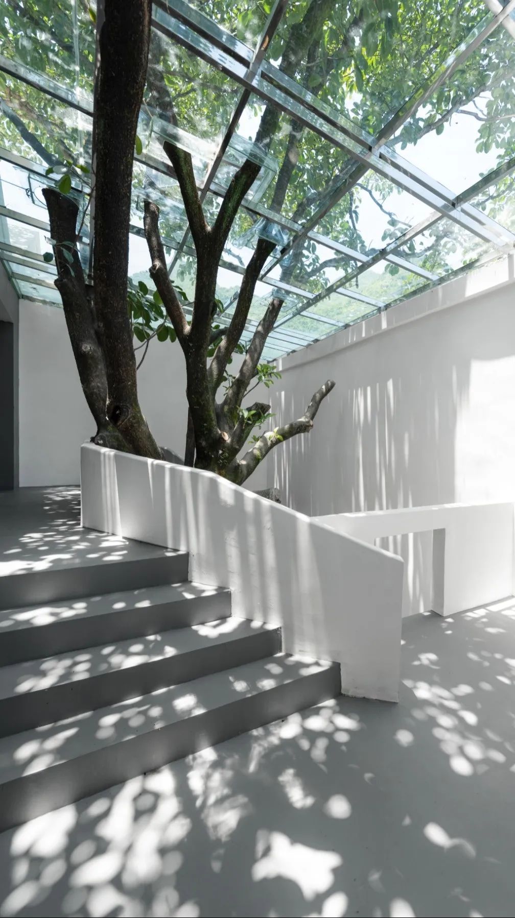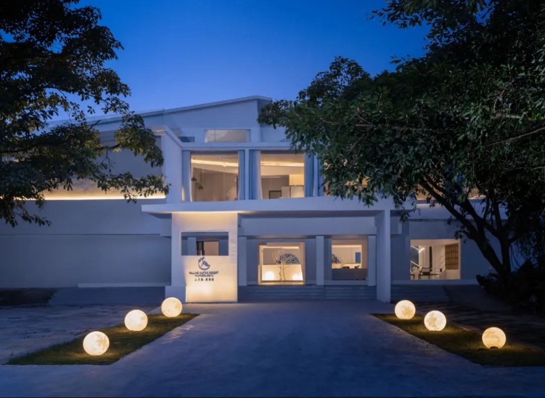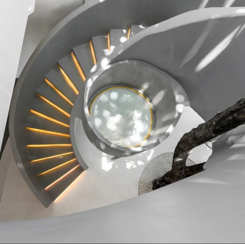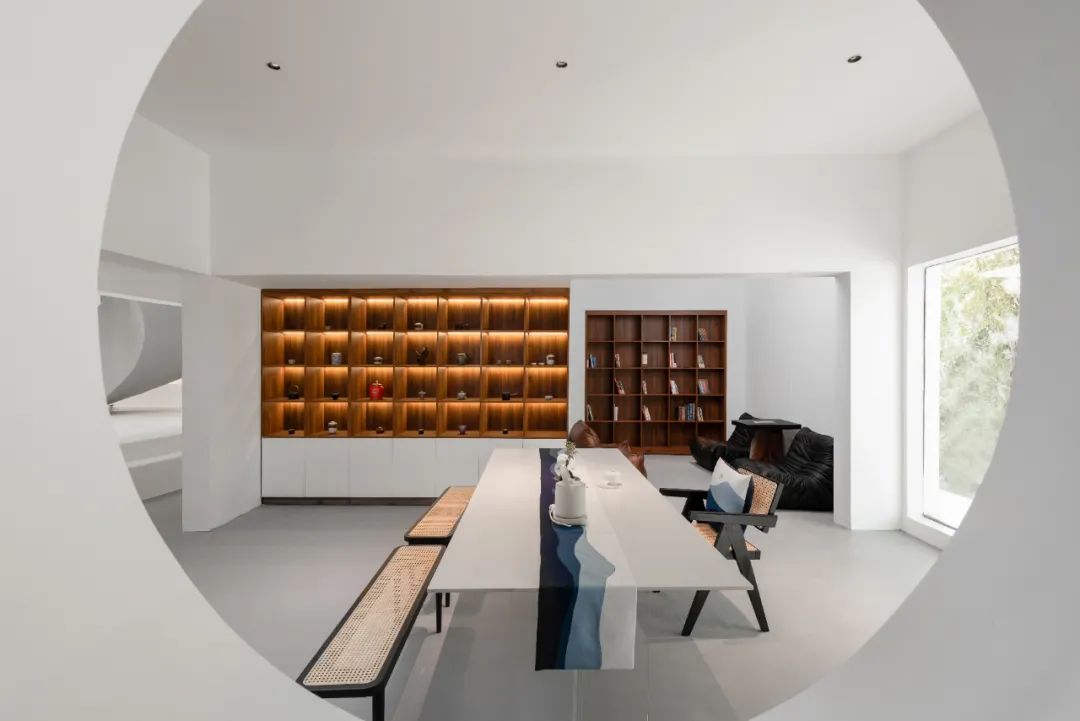 这里以白色为主调,旋转楼梯、弧形吊顶、圆形灯台……山月集把几何线条运用得淋漓尽致,极简风格让人感觉整洁优雅。
