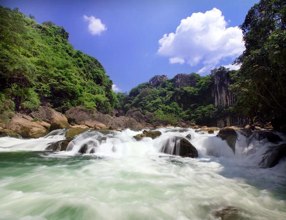 四周的喀斯特群山被一条银河缠绕,如同融化的星辰从半空流淌而过。瀑水飞溅而出的水花氤氲成乳白的轻薄烟云扑面而来,仿乎进入了世外仙境。