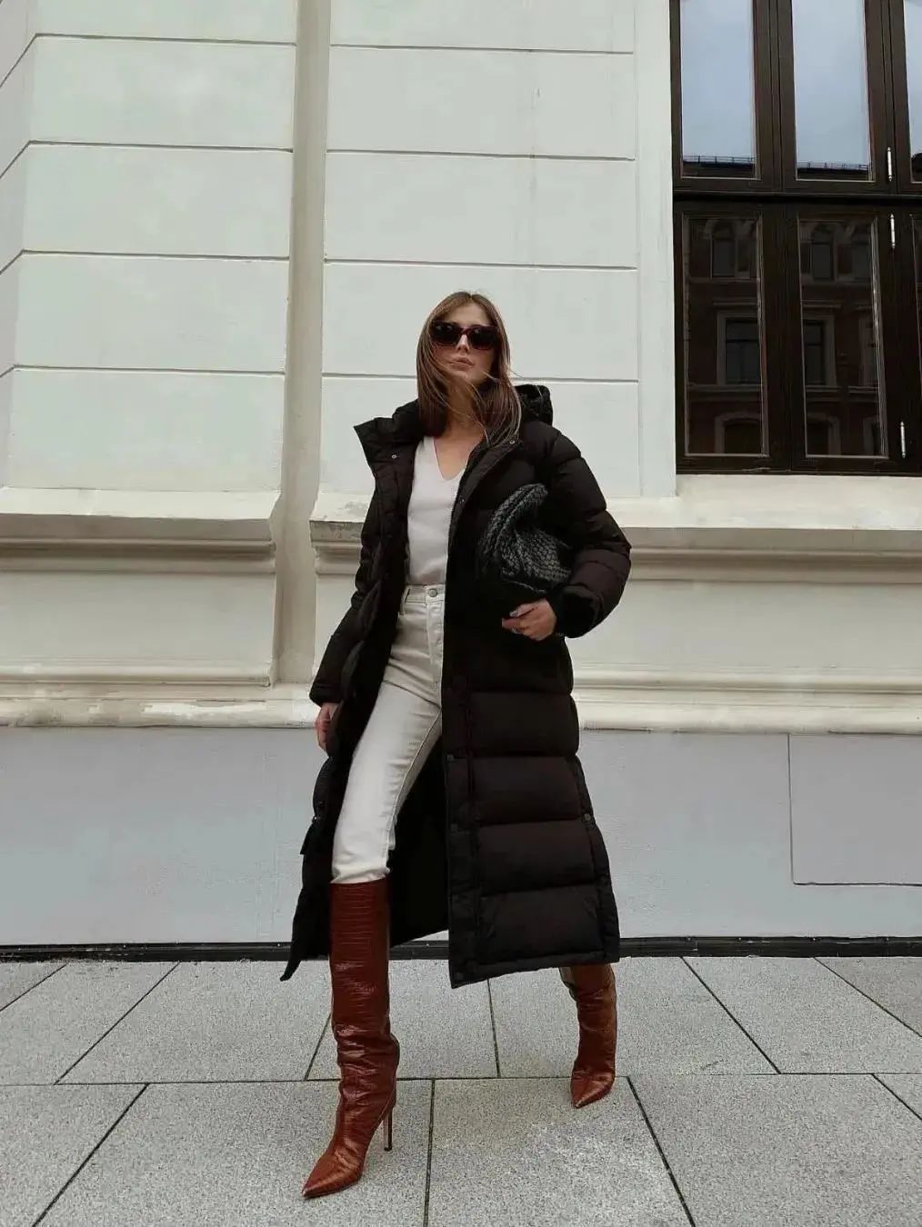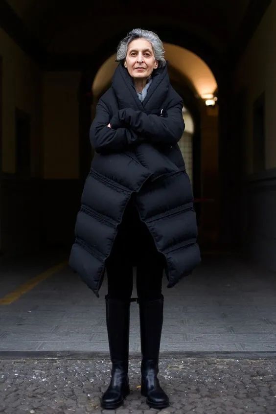 本身羽绒服的蓬松感容易让穿着者显得臃肿,所以挑选带细跟的长靴,可以帮助人们转移视觉中心,而整体黑色的搭配也能更加显瘦。