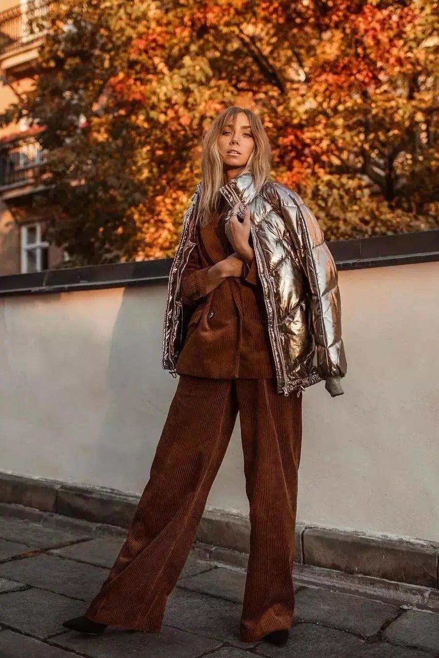 除了硬挺的牛仔面料,我们还可以选择厚实柔软的灯芯绒阔腿裤,搭配休闲/运动鞋,软软糯糯的特别适合小个子女生穿。
