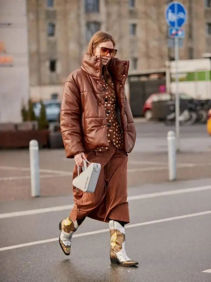 光泽感极强的皮质羽绒服,相对来说比较硬挺,与外套相近色系的内搭,可以弱化其正式、严肃的氛围感,让整体造型更加柔软、有亲和力。