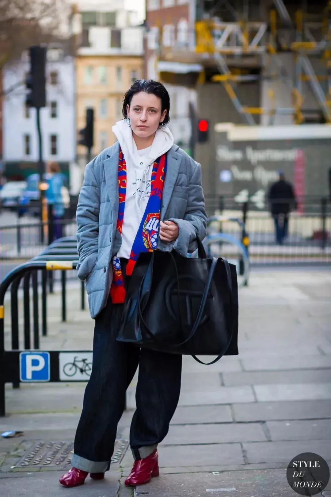 不仅如此,同色系的卫衣+西装+羽绒服,慵懒中透露出一股力量,颇有个性。