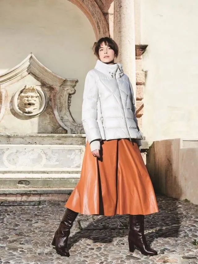 软糯的羽绒服少了一丝硬气,半身裙选择硬挺的皮质半身裙,搭配粗跟的长靴,平衡女性的优雅与强势,更加出挑,优雅同时不失个性。