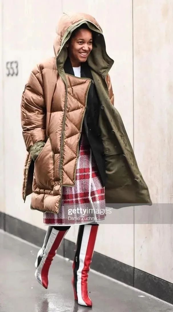 内搭裙子时,更流行穿长靴仙女们在冬天也不会忘了“裙子”,既然羽绒服都那么暖和了,配一条飘飘仙的裙子总不过分,搭配好看的长靴,还能帮忙裹住小腿,温暖时髦两兼得~