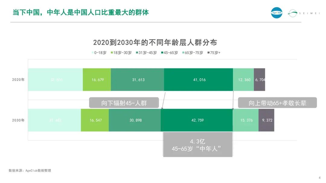 当下,中年人是中国人口比重最大的群体。4.3亿45-65岁“中年人”,向上进行孝心消费带动65+长辈,向下以前辈和引领者的身份辐射45岁以下人群。
