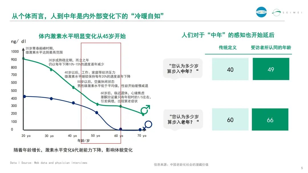 从个体而言,人到中年是内外部变化下的“冷暖自知”,随着年龄增长,激素水平变化和代谢能力下降,影响体貌变化。
