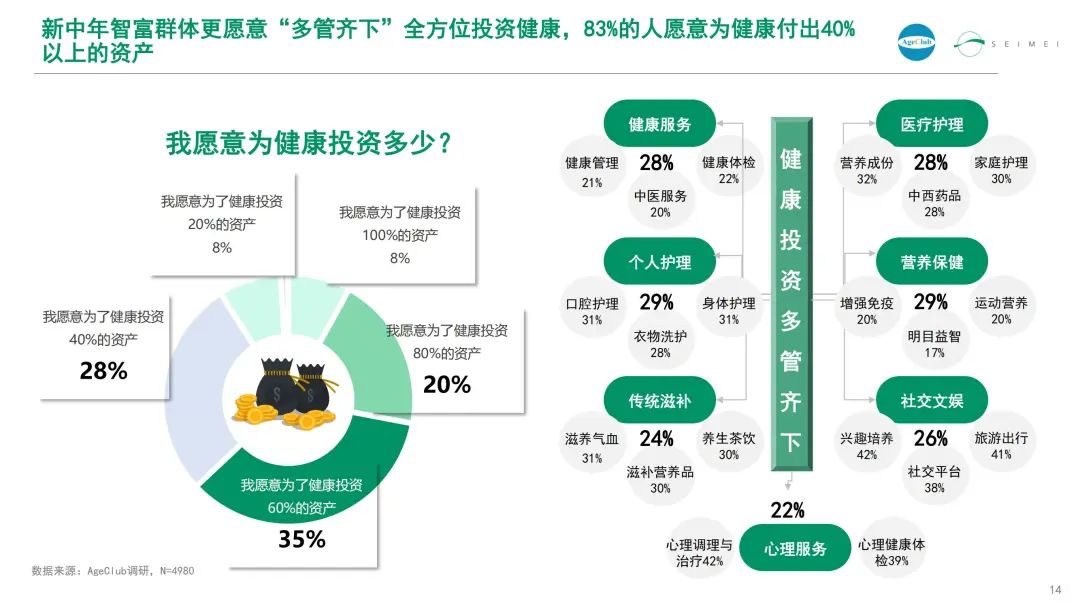 在新中年智富群体中,64%的人担心身体机能退化,58%的人担心慢病困扰;大多数人都希望通过加大储蓄对抗未来身体健康不确定性带来的风险。他们更愿意“多管齐下”全方位投资健康,83%的人愿意为健康付出40%以上的资产。