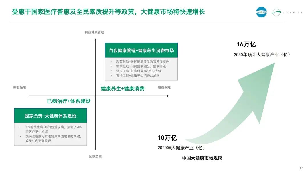 受惠于国家医疗普惠及全民素质提升等政策,大健康市场将快速增长。其中,自我健康管理维度下的健康养生消费市场,增长潜力巨大。
