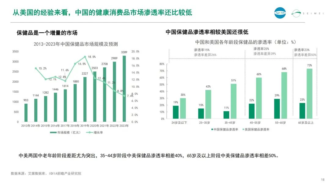 从美国的经验来看,中国的健康消费品市场渗透率还比较低。35-44岁阶段,中美保健品渗透率相差40%,65岁及以上阶段中美保健品渗透率相差50%。