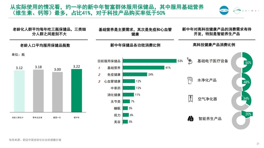 从实际使用的情况看,约一半的新中年智富群体服用保健品,其中服用基础营养(维生素、钙等)最多,占比41%,对于科技产品的购买率低于50%。