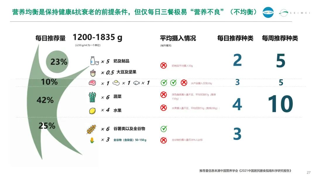从40岁开始衰老逐渐加速,大脑系统、胃肠系统、骨骼和肌肉系统等会因衰老进程加速整体机能衰退,营养均衡是保持健康&抗衰老的前提条件,但仅每日三餐极易营养不均衡。