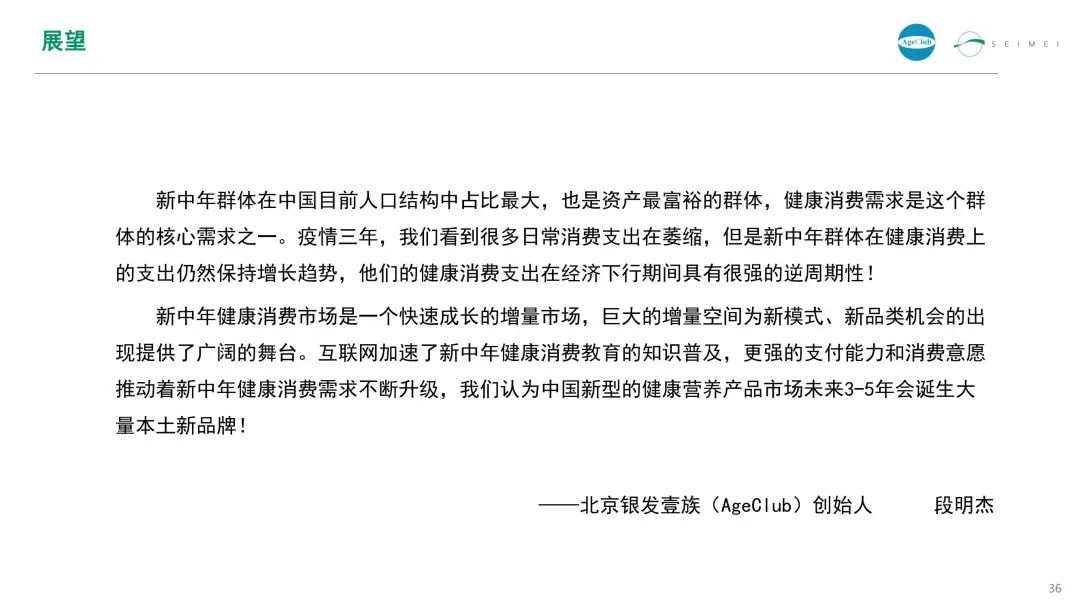 AgeClub创始人段明杰表示,新中年健康消费市场是一个快速成长的增量市场,巨大的增量空间为新模式、新品类机会的出现提供了广阔的舞台。