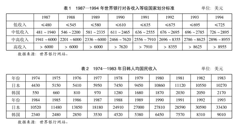 世界银行从 1987 年开始将国家划分为 “低收入、中低收入、中高收入、高收入”四种收入等级,并逐步提高各类别门槛。即使按照 1987 年的划分标准,即高收入国家为人均国民收入 6000 美元,中高收入国家为 1941 ~ 6000 美元,中低收入国家为 481 ~ 1940 美元 ( 表 1) ,日本已于 1978 年进入高收入国家 ( 当年人均国民收入 7450 美元) 行列 ( 表 2) 。对比历年划分标准和韩国人均国民收入情况可以发现,韩国于 1974 年进入中低收入国家行列 ( 当年人均国民收入 550 美元,高于 1987 年中低收入国家门槛) ,1981 年进入中高收入国家行列 ( 当年人均国民收入 2030 美元,高于 1987 年中高收入国家门槛) ,1993 年进入高收入国家行列 ( 当年人均国民收入 9010 美元,高于 1993 年高收入国家门槛) 。
