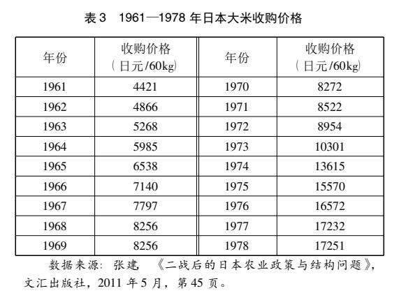 为解决二战后面临的粮食紧缺问题,以及提高种粮农民收益,日本于 1960 年后采用 “生产费用及收入补偿方式”计算政府收购米价,即核算大米生产成本时用城市职工日工资代替农业日工资,并据此设定足以覆盖成本的收购价,从而保证农民和工人消耗相等的劳动时间可以得到相同的劳动报酬。在该定价机制作用下,20 世纪 60 年代日本政府收购大米的价格不断得到提高。1961—1969 年,大米收购价格由每 60 公斤 4421 日元增至 8256 日元,8 年间几乎翻了一番,年均增长 8. 1% (表 3)。除 60 年代末因大米生产过剩不得不在一定程度控制收购价之外,日本向高收入国家迈进时期大米价格持续提高。韩国的做法与日本相似。1964 年韩国政府采用 “平衡定价”方式,即在决定农产品价格时既考虑其生产成本,又参照同期非农产品价格的变动因素,计算出 “平衡价格”,然后再以适当高于此的价格收购农产品。1968 年又推出了 “高米价政策”,连续 4 年大幅度提高大米收购价格,提高幅度分别为 17% 、22. 6% 、35. 9% 、25% (徐永祥,2009)。