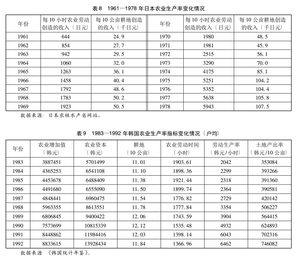 (三)农业土地产出率和农业劳动生产率快速提高生产条件的改善促进了农业土地产出率和劳动生产率的大幅提高。从 1961 到 1978 年,日本每 10小时农业劳动创造的收入由 644 日元增至 5943 日元,增加了 8. 2 倍,年均增长 14% 。每 10 公亩耕地创造的收入由 2. 49 万日元增至 10. 75 万日元,增加了 3. 3 倍,年均增长 9% (表 8)。以稻谷为例,其单位面积投入的劳动时间 1960 年为 91 小时,1966 年减少为 74 小时,而在 1970 年进一步减少为 62 小时; 大米单产由 1950 年的每公顷 3271 千克增至 1978 年的 4941 千克,增长了 51. 1% 。1983—1992年,韩国农户平均每小时创造的农业增加值由 2042 韩元增至 6462 韩元,年均增长 13. 7% ; 每 10 公亩创造的农业增加值由 353084 韩元增至 746082 韩元,年均增长 8. 7% (表 9)。
