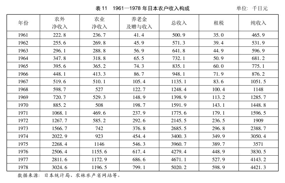 值得注意的是,城市化以及乡村非农产业的发展、非农就业机会的增加为日韩农民收入的增长做出了重大贡献。农村非农产业的发展以及交通设施的完善使农户不用离开农村就能就地兼业,同时农业生产技术的进步使得农户以兼业方式完全能够进行水稻等土地利用型农作物的生产,故大量日本农户采用了兼业方式,既通过从事工业、服务业获取农外收入,同时也未放弃农业生产。日本农外净收入占农民总收入的比重由 1961 年的 44. 5% 增至 1978 年的 60. 2% ,而农业净收入占比由 47. 3% 降至23. 8% (表 11)。