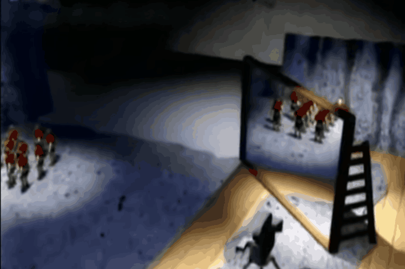 这种效果比《 卓别林 》里的遮罩强的地方在于,因为镜子反射的是真实的场景,所以会有物体景深,显得更加真实。