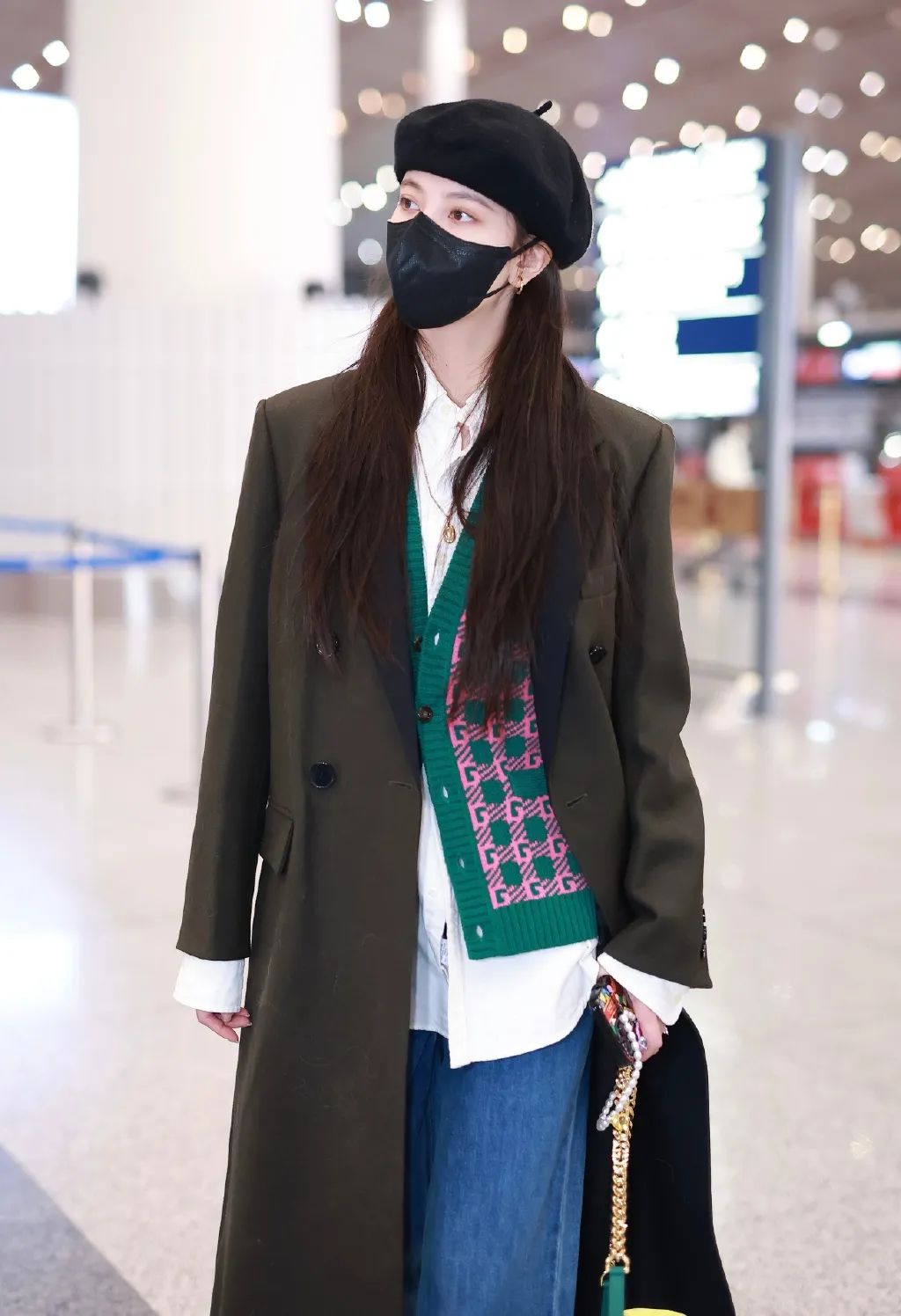 内搭绿色奶奶衫,复古香槟棕的大衣营造温暖秋冬氛围,优雅且高级。