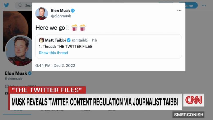 三小时后,记者马特·泰比(Matt Taibbi)基于推特的内部文件,发布了一条30多条推文的长文,披露了他所称的“一个人类制造的机制脱离了设计师控制的弗兰肯斯坦式的故事”。对马斯克来说,这次发布驱散了笼罩在推特上空的乌云,他正在努力按照自己的形象塑造推特,净化内部文化。有可能是马斯克亲自把文件交给了泰比,但这一点无法确定。马斯克确实在文件发布之前和发布过程中大肆宣传,但泰比只表示他引述了“内部消息来源”。
