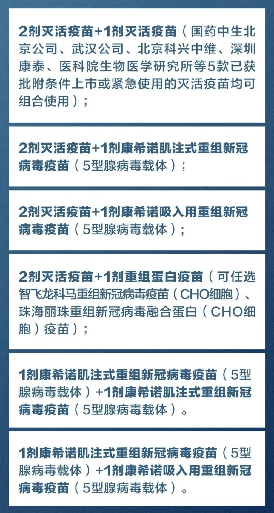 其中,吸入式“重组”疫苗为康希诺吸入式重组新冠病毒疫苗(5型腺病毒载体),目前只能用来做“加强针”,不能做第一针;打针式“重组”疫苗为珠海丽珠重组新冠病毒融合蛋白(CHO细胞)疫苗,目前只能用来做“加强针”,不能做第一针、第二针。