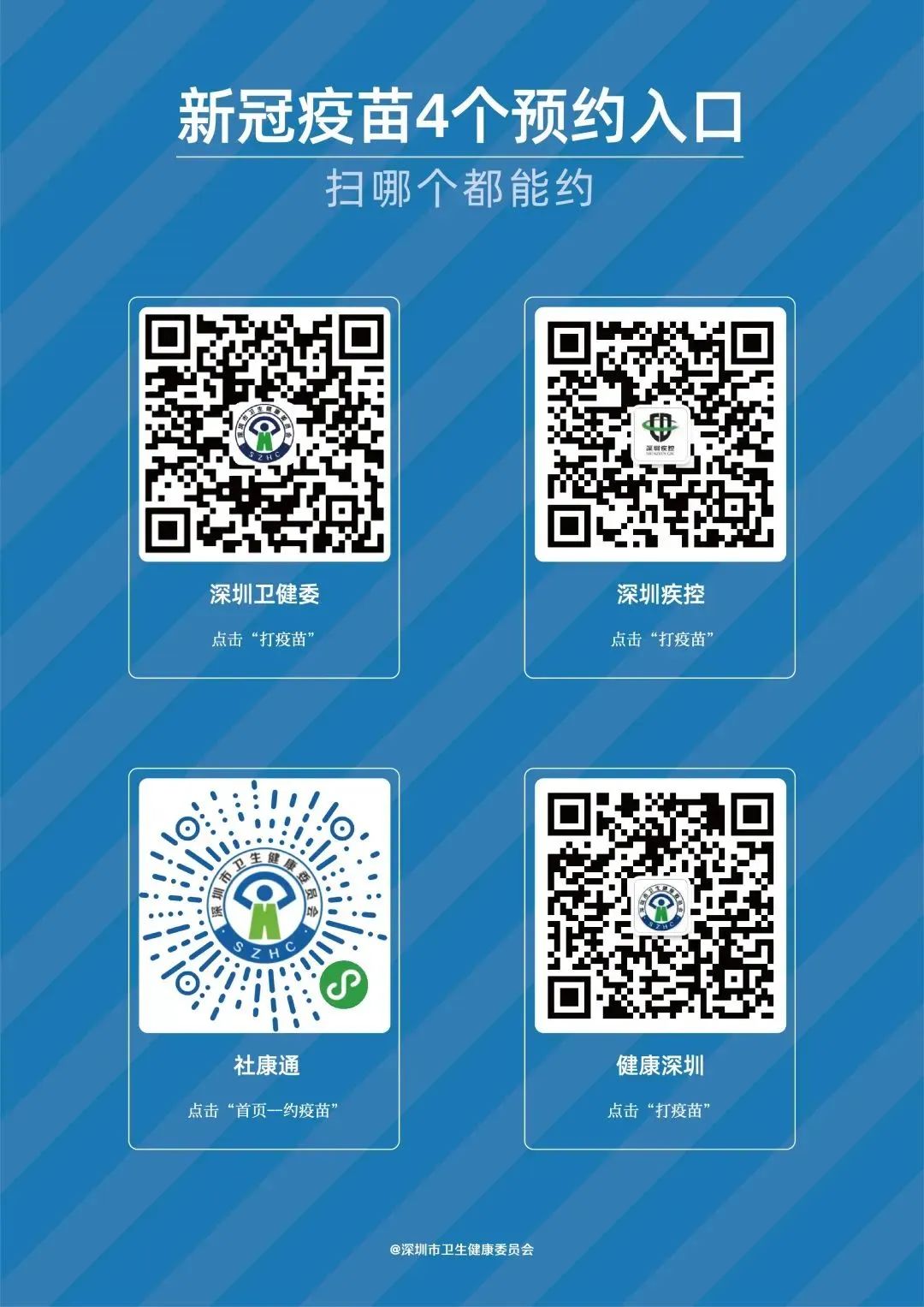 有需要打新冠疫苗的市民,可以通过“深圳卫健委”“深圳疾控”“健康深圳”微信公众号,或“社康通”小程序进行预约。