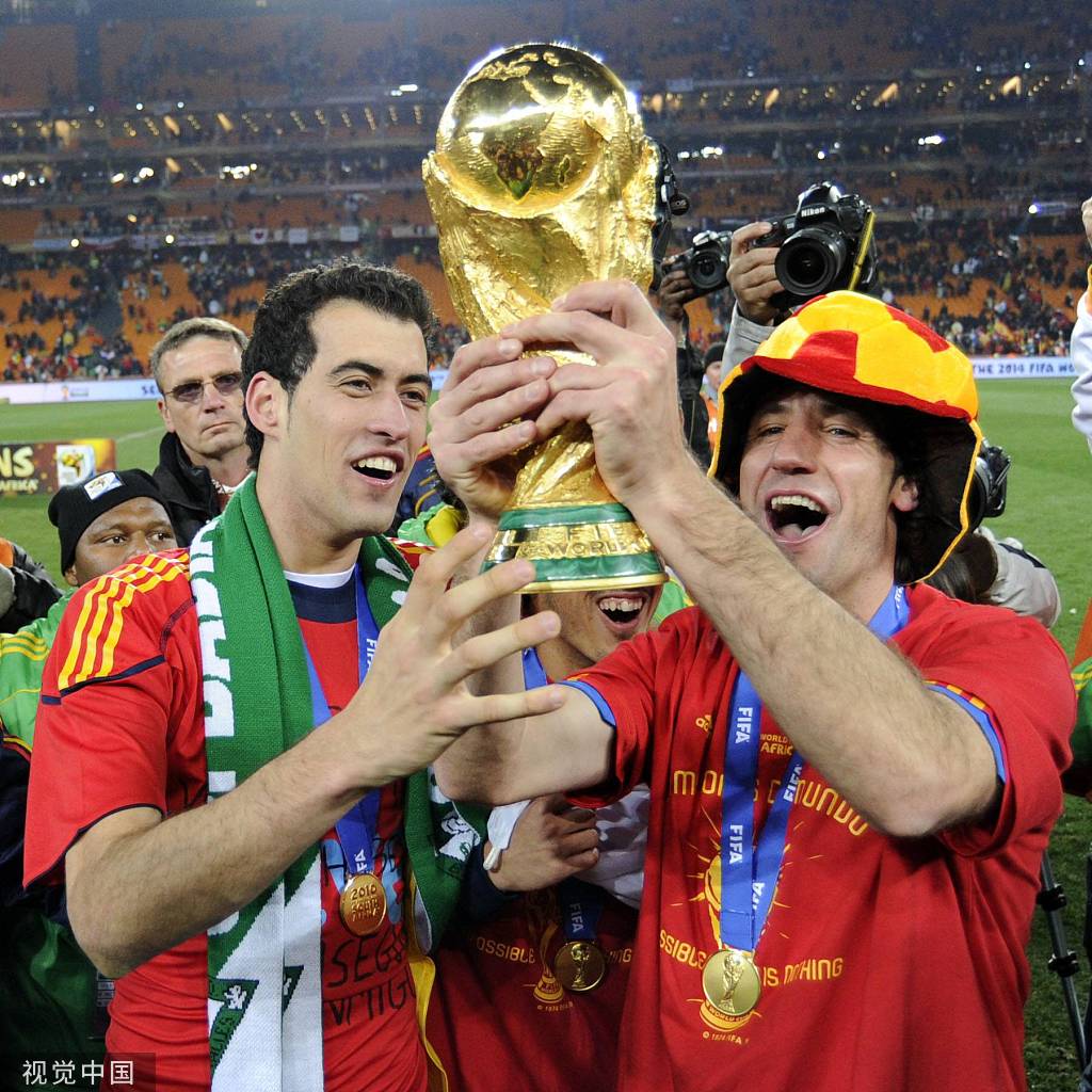 2010年,布斯克茨(左)随西班牙队拿下世界杯。