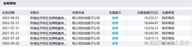 以龙狮瓶盖为例,据wind发布的数据显示,茅台和龙狮瓶盖每年会有两次进行关联交易,分别在每年的一季度、三季度,单笔关联交易的金额均在1亿元以上。