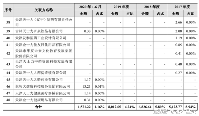 而公司的第一大客户天津帝泊洱生物茶连锁有限公司,在2017年到2019年向国台所采购的金额分别为3641.08万元、4816.56万元、4661.46万元,占同期关联交易总额的比例分别为71%、70.55%、57.9%,占国台酒业营收比例分别为6.36%、4.09%、2.47%。