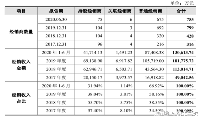 另外,国台酒业104家经销商持股比例为25.96%,在2017年—2019年,持股经销商加关联经销商占到经销收入的65.5%、61.45%、41.85%,截至2020年上半年,两者合计占比仍高达33.08%。