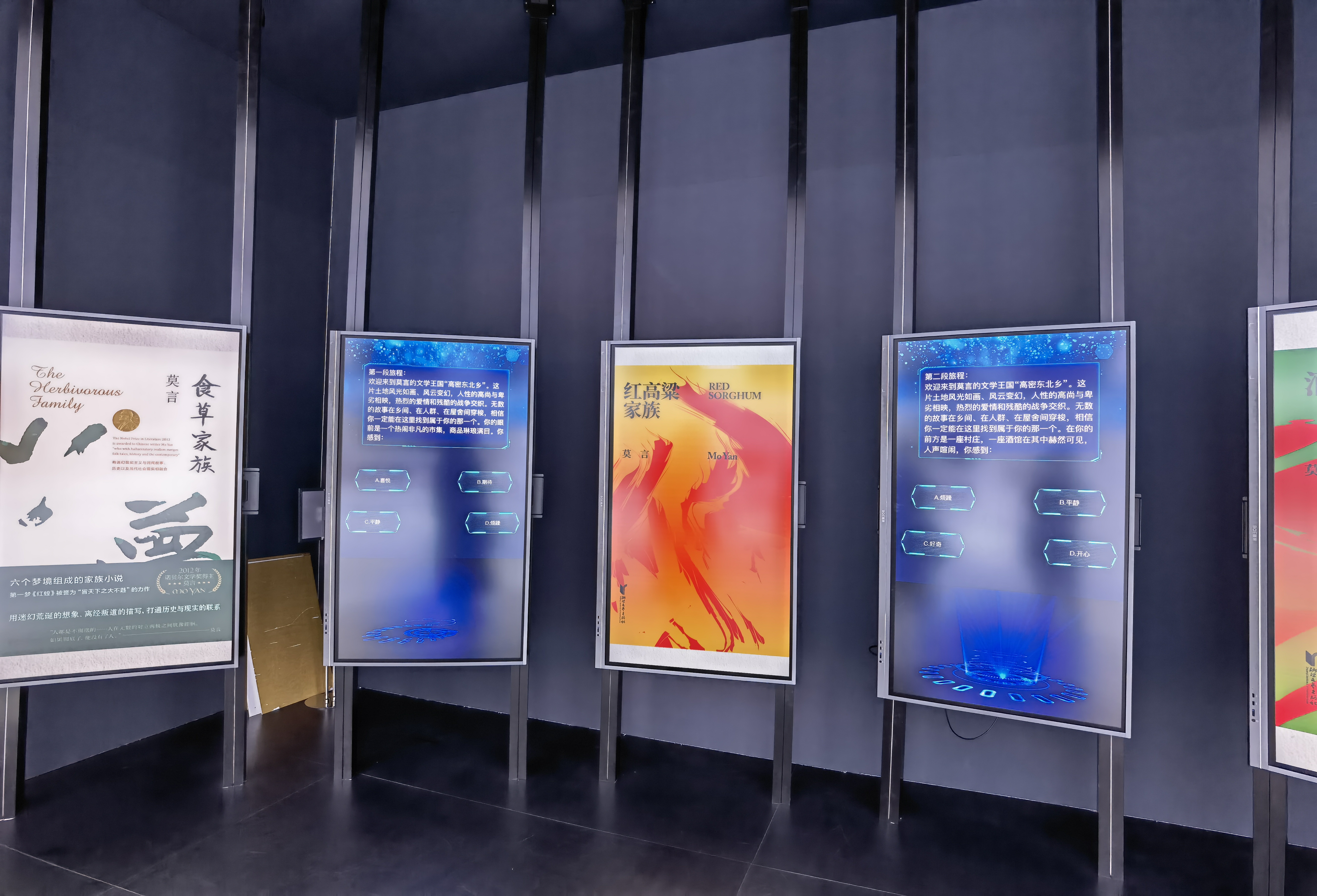 除了欣赏展品,读者也可以在展览中获得一些特别的体验。比如一侧的多媒体区再现了2012年诺贝尔奖颁奖典礼的盛况,另一侧的互动区则让读者通过一段前往“高密东北乡”的文字冒险游戏找到最适合自己的莫言作品。