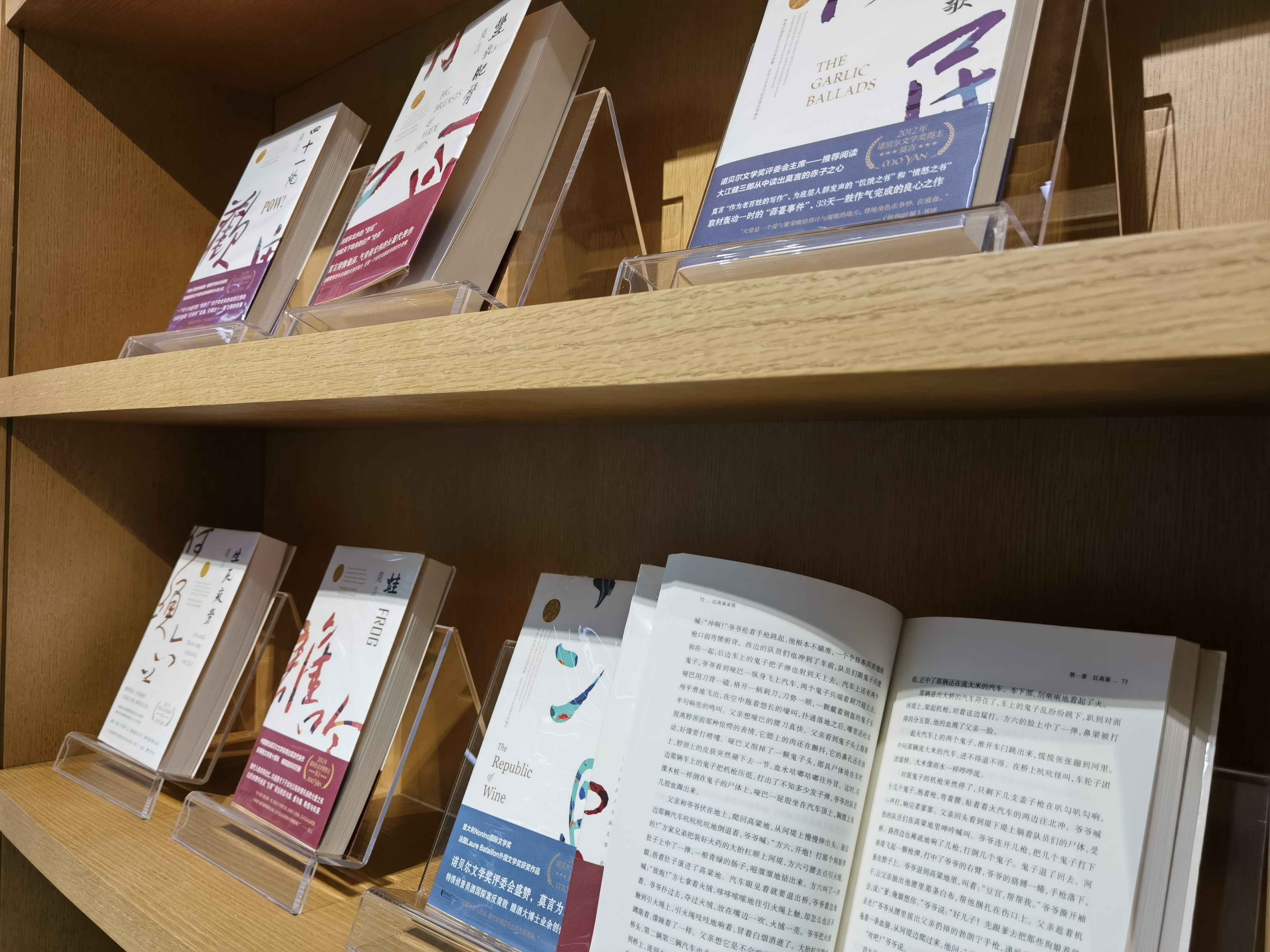 同时,在上图东馆七楼,由浙江文艺出版社推出的莫言作品全品种无塑封展出,读者可直接翻阅、试读。2017年,《莫言长篇小说全集》十一部出版,后来又陆续出版了包括长篇小说、中短篇小说、散文、演讲、剧作等在内的莫言系列作品七十余个品种(版本),“莫言作品全编”系列、“莫言作品典藏大系”系列、“莫言短篇小说精品”系列等陆续上市。《红高粱家族》《蛙》《丰乳肥臀》《酒国》《白狗秋千架》等经典畅销作品不断加印,获得了一代又一代读者的喜爱。