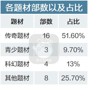 按题材划分,传奇题材16部,占备案公示总数的51.6%;青少题材3部,占备案公示总数的9.7%;科幻题材4部,占备案公示总数的13%;其他题材8部,占备案公示总数的25.7%。