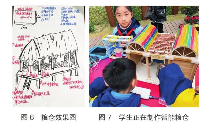 随着社会进步和科技发展,存储粮食的方式不断改进,新型智能化粮仓已经出现。智创粮仓数字课程是学校为“仓前符号”项目设计的创客课程,创设了编程和人工智能等学习场景,具有很强的创新性和实践性。智创粮仓数字课程的设计与实施,不仅呈现了仓前的地域特色文化,而且展现了农作物储藏技术的变革历程。教师以仓前的古建筑“四无粮仓”作为载体,采用实地调查和智能设计相结合的形式,开展智创粮仓的创意学习活动:第一阶段,组织学生自主设计“多功能粮仓效果图”(如图6),将“粮仓”的各功能模块以图文呈现;第二阶段,组织学生对电学、木工、3D打印、编程等内容进行综合性学习,参与智能粮仓的设计与制作(如图7),解决仓内温湿度的智能调控问题。教学过程中,教师引导学生体验上述项目的学习过程,培养学生的逻辑思维和信息素养。