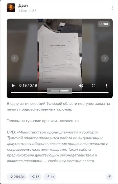 在Yandax反搜文中的“粮票”图片,能追溯到的最早消息来源是俄罗斯论坛Dvach于12月4日发布的一条匿名帖,该帖最初称“图拉地区的一家印刷厂接到了印刷食品券的订单”并上传了一段疑似为印刷厂正在批量打印“食品券”的视频,而当日下午4点该帖又更新称图拉地区工贸部给予了回应。