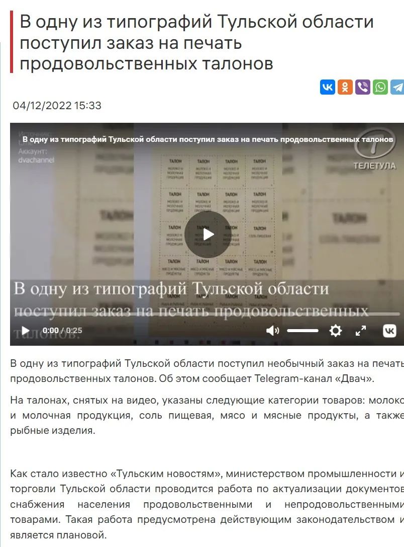 综上,网传说法没有来自俄罗斯政府以及俄工贸部的权威信源支持。相关说法最早见于俄罗斯Dvach论坛的匿名帖,该帖称“图拉地区的一家印刷厂接到了印刷食品券的订单”并上传相关视频,图拉地区工业和贸易部回应表示,“工贸部正在努力更新为居民提供食品和非食品产品的文件。此类工作是由现行立法规定并计划进行的。”俄局部地区新闻不能成为其全国发行粮票的证据,网传说法具有误导性。