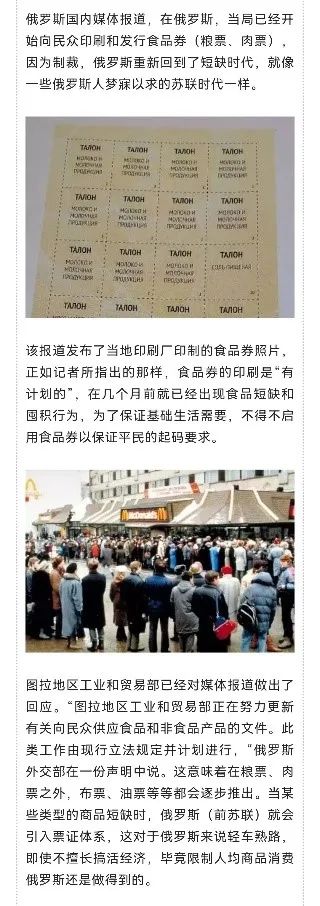 俄罗斯《观点报》今年初曾报道俄罗斯经济学家格林伯格的建议,“世界许多国家都在采取发放食品配给卡的形式,所以没有必要感到担心。在消费品价格持续增长的背景下,政府要么补贴主要食品生产商,要么向低收入居民发放食品配给卡。包括美国在内的许多发达国家都在向数百万民众发放,这没有什么不妥。”