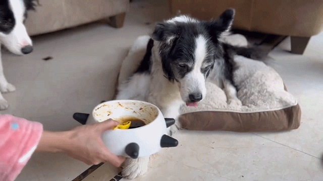 虽然妞妞已经看不见了,但是有东西送到嘴边,它都来者不拒,吃得很香。