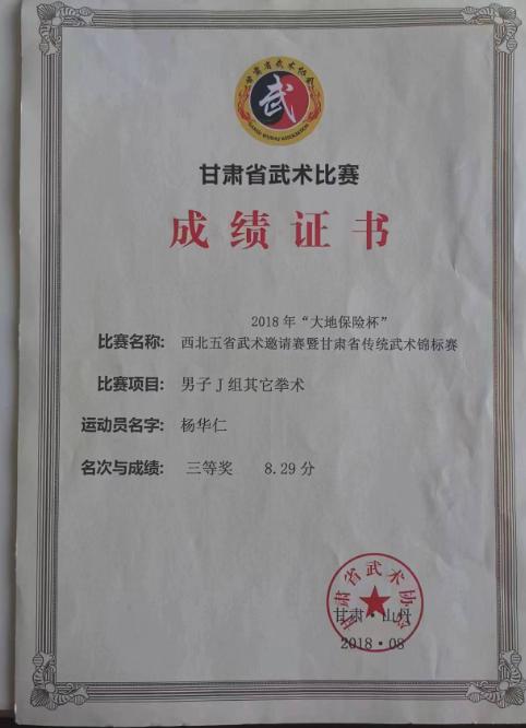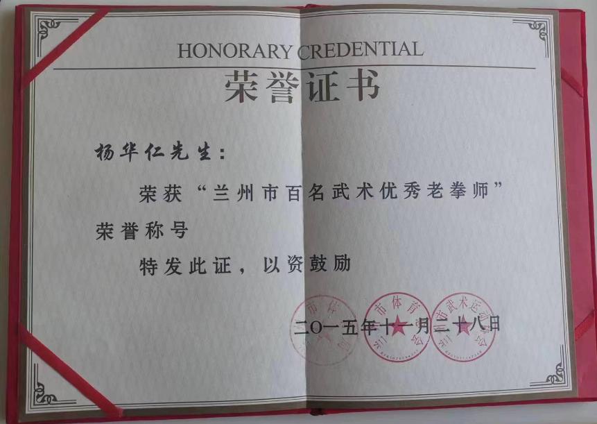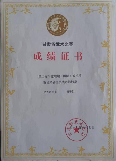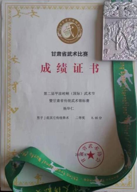 杨华仁:永登县古山乡人 ,武术六段,中国武术段位考试一级考评员,少年习武,师从陈历山先生,练习通备拳、八极拳、形意拳等。1981年在永登县城关镇中学组建武术队,学员在全县传统武术比赛中成绩优秀。1983年永登县首届武术协会成立,当选秘书长;1998年永登县第二届武术协会当选副主席;2010年永登县第三届武术协会当选主席至今。2017年8月第二届平凉崆峒(国际)武术节暨甘肃省传统武术锦标赛男子J组获得银牌;2018年8月张掖西北五省武术邀请赛暨甘肃省传统武术锦标赛男子J组获得三等奖;2015年获得兰州市百名优秀老拳师。