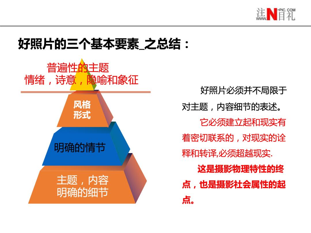 好照片的三条基本要素总结:好照片不局限于对主题、内容、细节的表述,它必须建立起和现实有着密切联系,对现实的诠释和转译,而不是对现实的复制,摄影注定要从现实走向超越现实的目标。当照片超越了对主题内容、细节、情节,以及风格形式的表现和记载之后,我认为最好的照片应该具备和大多数人都密切相关的普遍性主题。能够为人们所解读的情绪、诗意、隐喻性和象征性,每一个人读到这张照片的时候,能读到更多自己所理解的东西。在这个过程中,我就拍到了非常过瘾的照片,我逐渐享受到了摄影的乐趣。