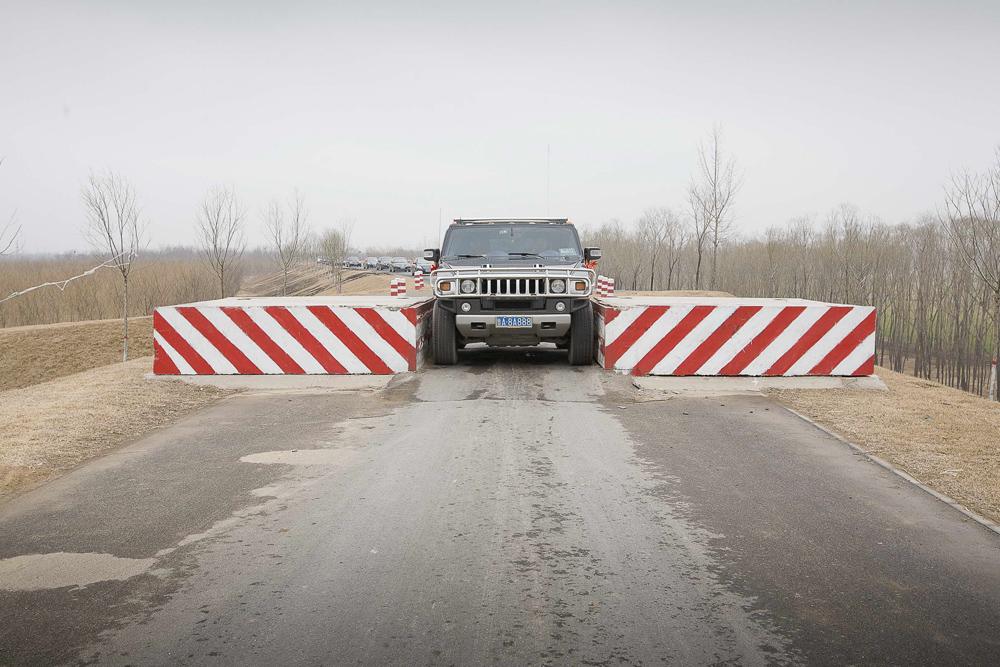 迎亲车队驶向毛家村,带头的悍马车小心地穿过水泥路障。这些路障是为了阻止大型卡车驶入保护村路而建。2012年3月 倪家村每个村子头上都修着一条路,因为村子里的路是村民自己花钱修的,所以在村头都设置了路障,它限制着外来超重车辆的驶入,以防损坏道路。但是,当村民举办婚礼的时候,他们会打开路障,使能够彰显他们社会关系和财富的汽车开进村子,显示村民的财富和品味。