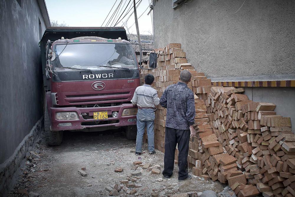 村民试图搬开路边堆放的砖块,以方便卡车通过。由于村内建设缺乏规划,导致村路曲折狭小,稍大的车辆无法在村中行驶。2012年5月由这个表象,背后折射出的是村民普遍具有的小农意识,只关心自己,并不关心集体利益。