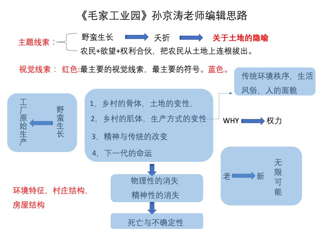 《毛家工业园》编辑思路孙老师在编辑《毛家工业园》的时候,有一个工作的笔记,这里,我和大家一起分享一下。它的主要线索就是野蛮生长——夭折,最后关于土地的隐喻,还有一个重要的视觉线索,红色和蓝色作为最主要的视觉线索和视觉符号,从野蛮生长到工厂的原始生产。在编辑的过程中把整组照片分为四部分,分别是:第一是乡村的古体土地的变性;第二是乡村的集体生产方式的变形,也就是传统环境秩序、生活风俗和人的面貌的改变;第三是精神与传统的改变;第四是下一代的命运。由此推导出物理性的消失和精神性的消亡,从老到新以及无限的可能性。
