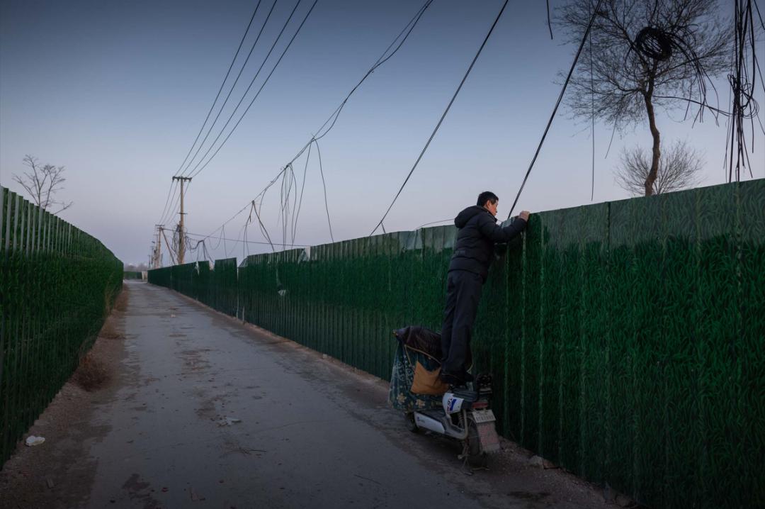 2021年的2月11日是除夕,那天下午,我照例来到了毛家村。村子里空无一人。往常的祭祀也因为疫情少了很多。临走的时候,我看到了村民王平,他正站在他的电瓶车上,跨过毛家村的围栏,试图再看一看自己的家在拆迁之前的情景。我看到了这个情况,就迅速地按下了快门,留下的这影像——故土难离。