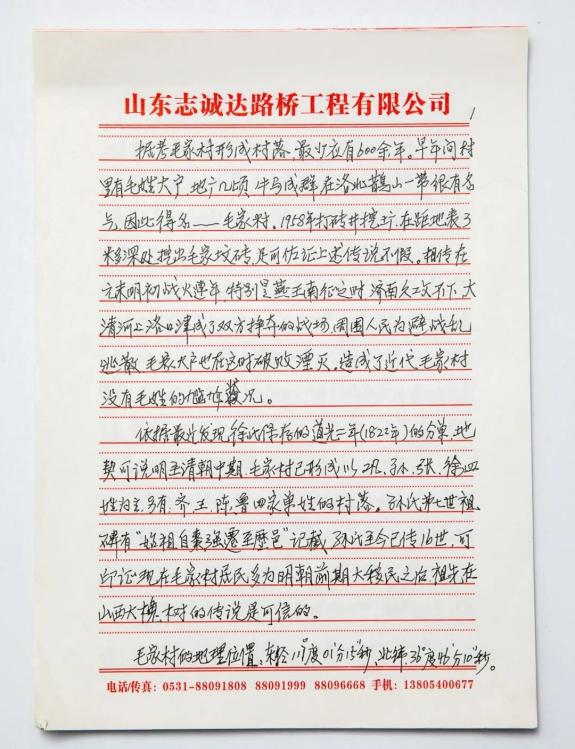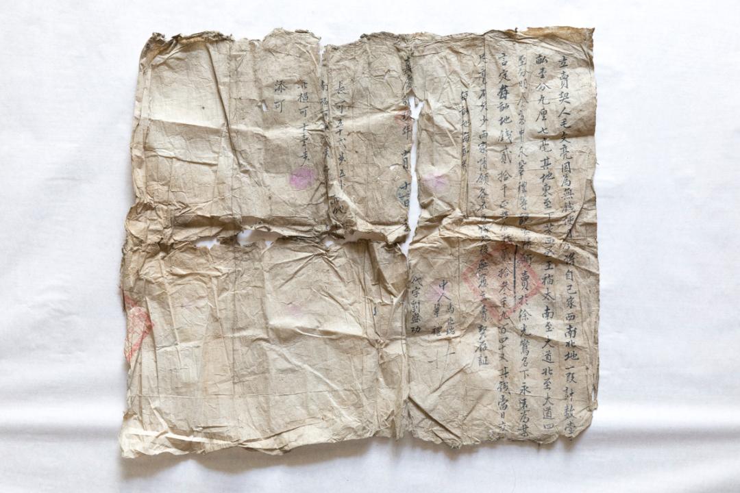 我印象非常深的是在2019年6月10日的下午,我的好朋友巩建平打电话说,要我到巩万荣家看熟人收藏的好东西。他在我面前打开了一张揉得非常皱的棉纸。好容易看出来这件破损严重的绵纸是张地契,被装在一个落满灰尘的木盒子里。我们小心地展平一看,发现落款的时间竟然是嘉庆十九年,就是公元1814年。我抑制住内心的惊喜继续看,上面写着:“立卖契人毛文亮因无钱使用,今将自家西南北第一段计数一亩一分九厘七毫情愿卖于徐光銮名下永远为业……”后面还说了好多。这份土地契约给我带来了两大收获:第一个是毛家村有实物可考的历史上溯到了1814年;更为重要的一件事儿是,这份契约记述了当年村里一位姓毛的人士,因为经济窘迫,把土地卖给了村里如今还有后裔的徐氏家族的行为,这和村里老人传说中的古时候,毛家村有毛姓家族,后家族落败是完全吻合的。我终于找到了可以证明传说中的实物!在巩万荣家拍摄完,就立刻赶到了孙传荣老人家向他报告了我的发现,在数码相机的液晶屏上把刚刚拍摄的照片放大了给他看,我们两人四手相握,开怀大笑。我们觉得做了一件非常有意义的事情。
