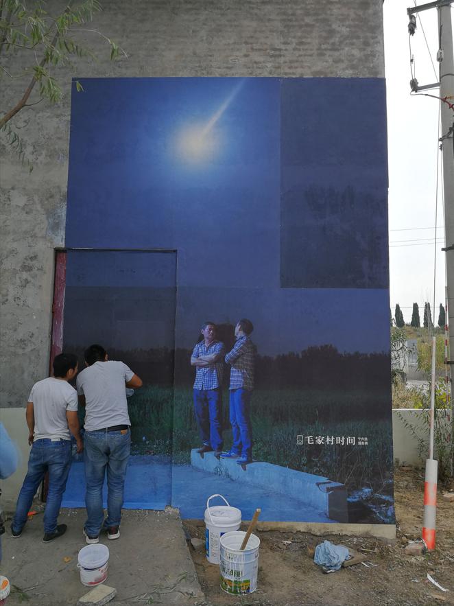 当时构想的就是让这些照片再次回到毛家村,我们的展陈形式是让这些照片永远留在毛家村。把这些照片贴在楼上,贴在矮墙上,贴在篮球球架上,挂在村口的小树林里……而且这些照片基本上采取的都是无害的形式。这些照片以后会随着时间自然降解,而不会给村子造成不可降解的垃圾。我们还把照片贴在村子广场的乒乓球台上和篮球架上,尽量让展览和村民的日常生活行为融为一体。刘宇老师了解了我们的创想以后,也来了兴趣,他说:“你可以把盖房子的土吊车也放到展场上去,钢栏底下挂一个吊笼,用吊笼变做一个农民盖房子的专题摄影展,效果一定很不错!”很快我们就确定了展览方案。