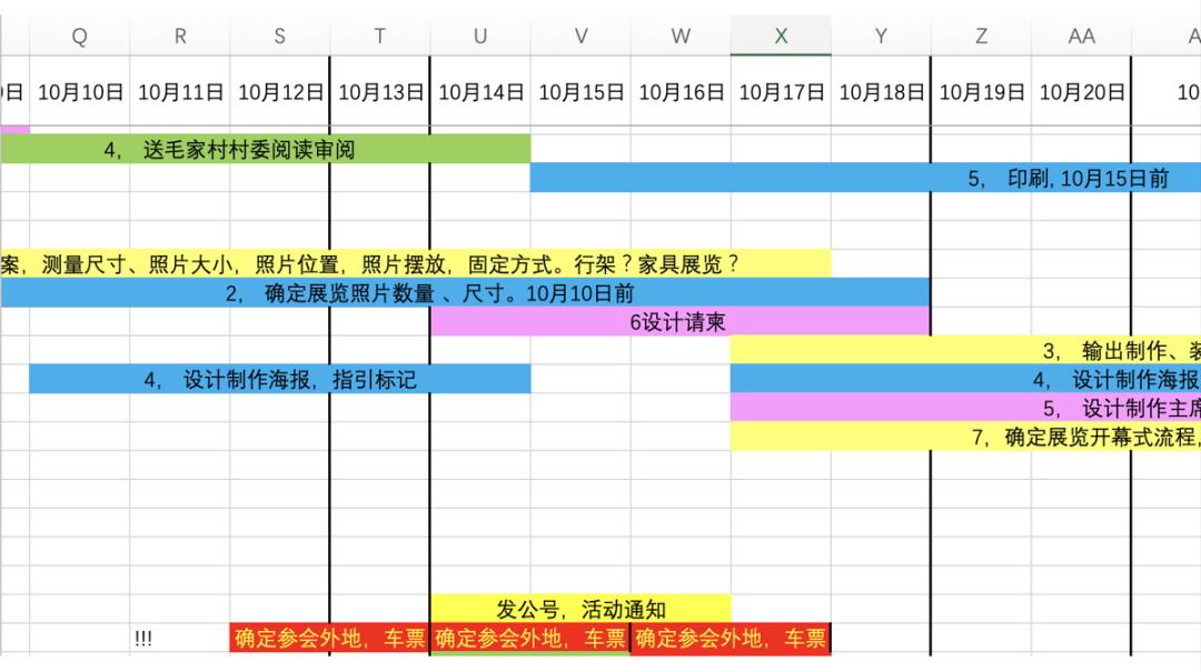 在国庆节期间,我在家里就开始了各种各样的设计、布展、打印、印刷,包括安排来宾的食宿、接送、开幕式。无数的头绪都在等着我们确定,每一项似乎都是一个看不见底的无底洞,随时吞掉我所有的时间,带给我无限的焦虑。我甚至觉得无论多艰苦的拍摄,都比这种备展工作要有趣。所以我暗下决心,再也不做这样的展览。发完牢骚,我也只能继续做计划,把所有的工作日程都倒排一个工期,做一个详细的计划表,逐字逐个逐项落实,如蚂蚁啃骨头一般地把它挨个完成。