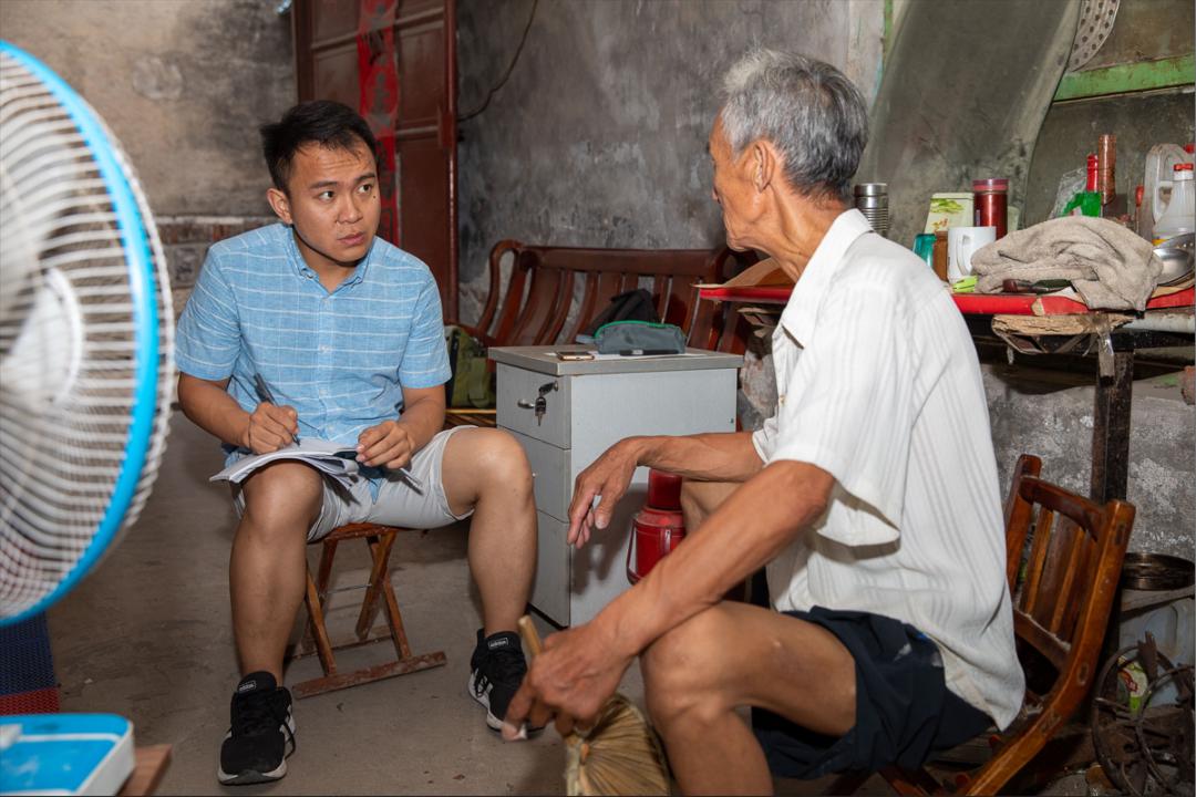 李岩在做田野调查,采访巩振童老人。2019年7月到了2019年7月底,我邀请了我的项目合作伙伴,就读于北京工业大学社会学专业硕士研究生的李岩来到村里做一个社会学的调查,用了大约一周时间。在他访问之前,我把所有的寻访对象、拍摄、收集整理的图文录音全部都提交给他,请他从社会学的角度,对毛家村的历史发展进行归集和整理。我们在此期间也收集了好多的资料,李岩的工作非常严谨,他寻访时几乎和每一位受访者都要录音,都要记笔记。有的受访者甚至反复的采访了三四遍。四周之后,我们就形成了一篇大约8000字的调查文章《在历史中观看现在》。