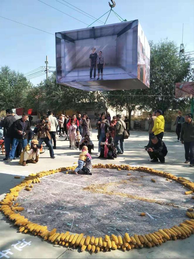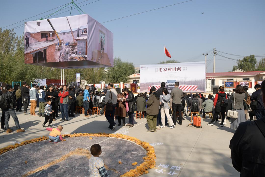 日越老师作为展陈的策划,是我最好的朋友,但这时候却成了我最强硬的敌人。开展前三天,他说,为了突显现场的农家气氛,他要求在现场所有的椅子都要换成村民各家各户使用家具、板材下脚料做成的半旧的小板凳,摆满两个篮球场需要两百多个。在土吊车的吊笼下边,为了展示和安全的需要,要用玉米穗和玉米摆成表盘的形状。而且还要在开幕前的一小时、半小时、十分钟、五分钟、前十秒钟都要播放,模仿广播电台标准报时的效果:“刚才最后一响是毛家村时间”的录音。展览那一天,我们按照这个标准的时间,每隔一段时间就播放毛家村标准时间,提示来看展览的各位领导、专家和嘉宾集中到广场来。