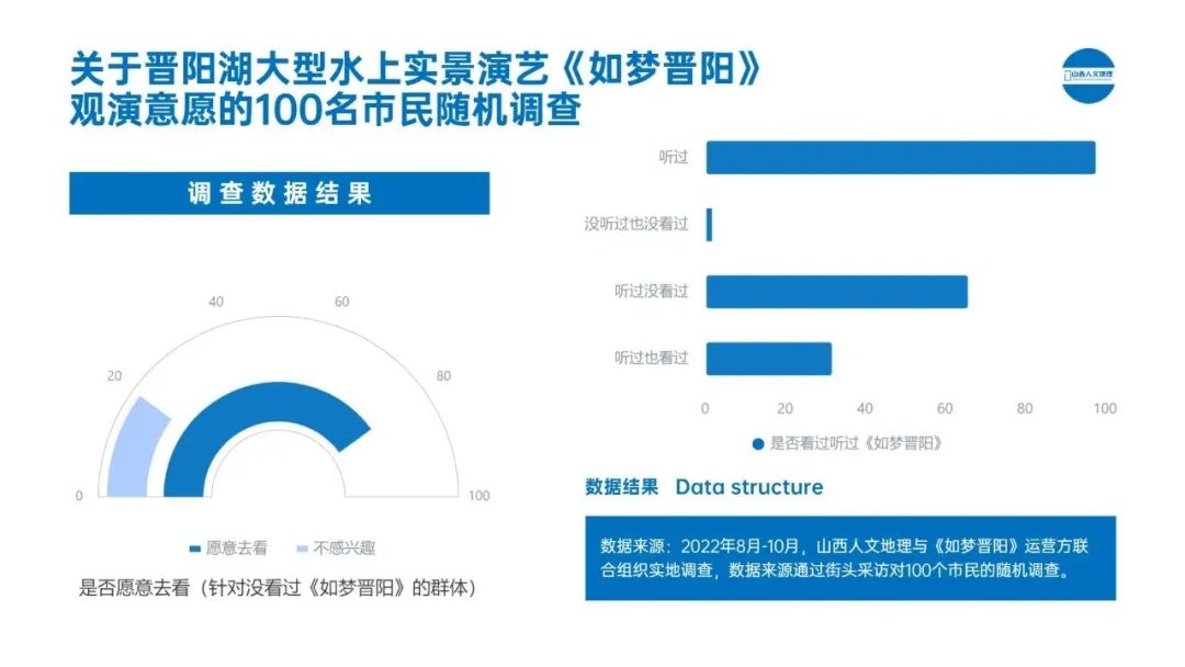 2022年8月-10月,山西人文地理与《如梦晋阳》运营方联合组织了实地采访调查,深入各个商区、居民区,横跨太原市南北各区,通过街头采访的形式,对100个市民进行随机调查。调查结果显示,“听过也看过《如梦晋阳》”的32人,占比32%;听过没看过《如梦晋阳》的66人,占比66%;没听过也没看过《如梦晋阳》的2人,占比2%,即听过《如梦晋阳》的群体占比为98%。
